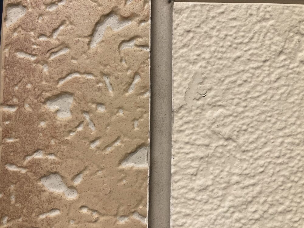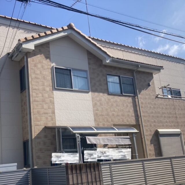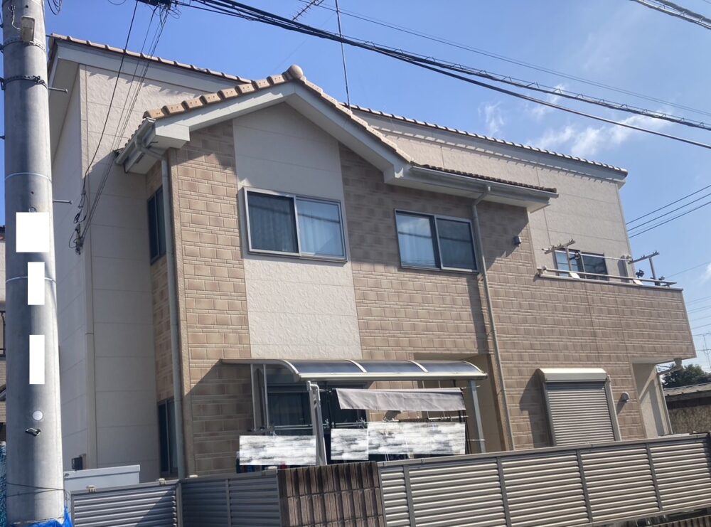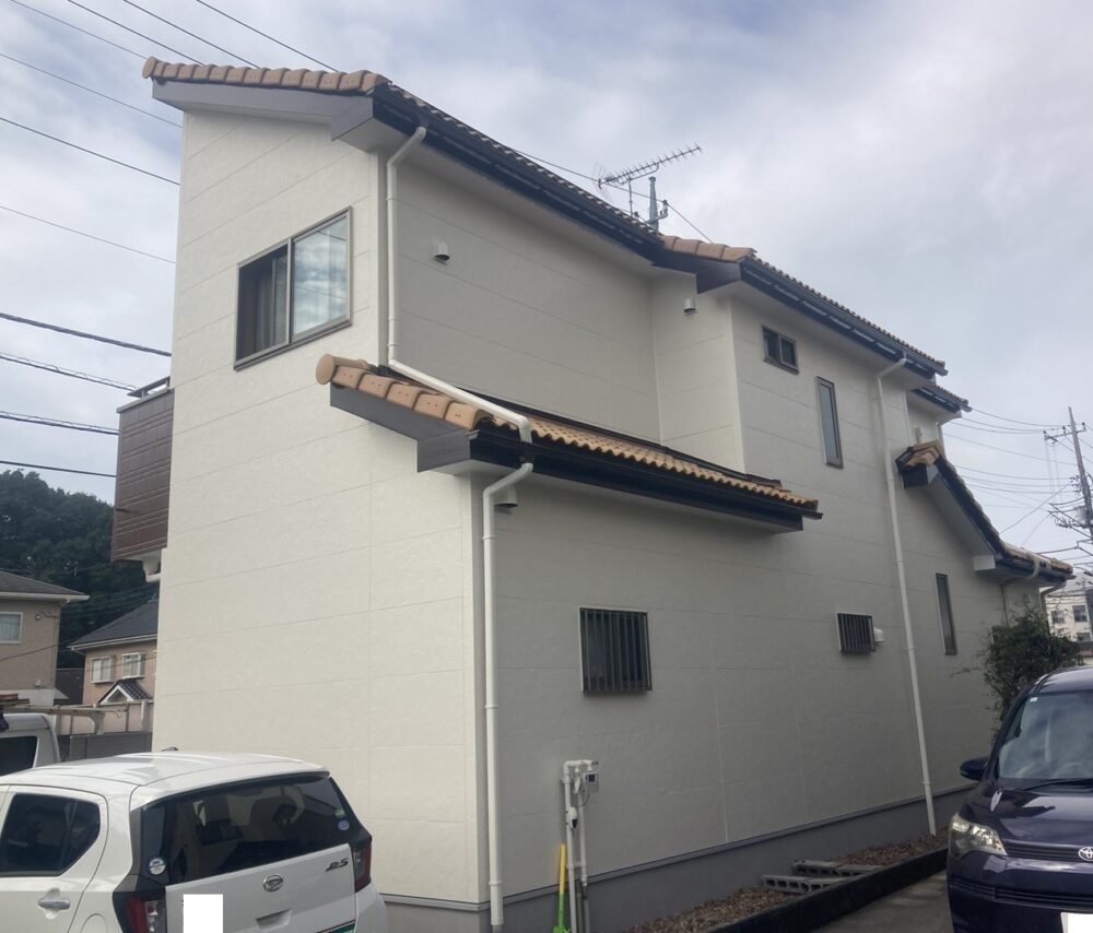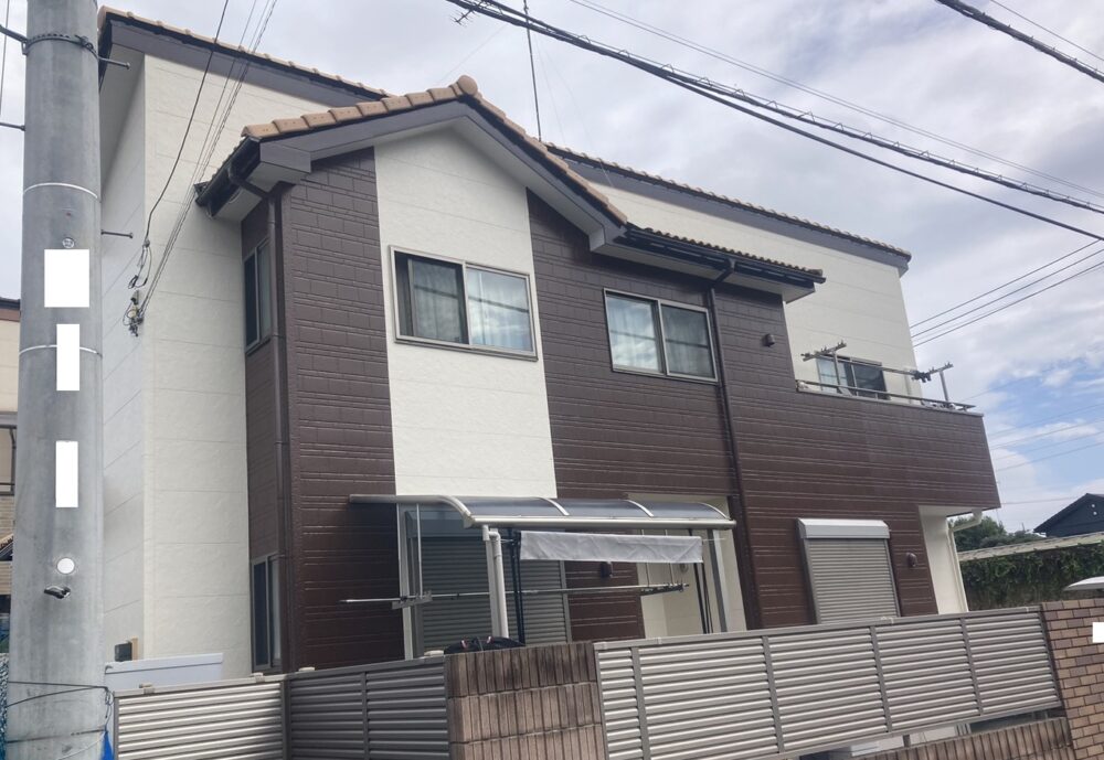 全体的に色褪せや汚れが進行しており、塗り替えの時期を迎えていました。屋根は瓦屋根でしたが、汚れやコケの発生が目立っていたため、高圧洗浄を行いました。外壁には高耐久の無機ハイブリッド塗装を採用し、ホワイト系の色でも美しさを長く保ち、丈夫で長持ちする仕上がりとなっています。アクセントカラーのブラウンが全体を引き締め、上品でとても素敵な外観に仕上がりました。