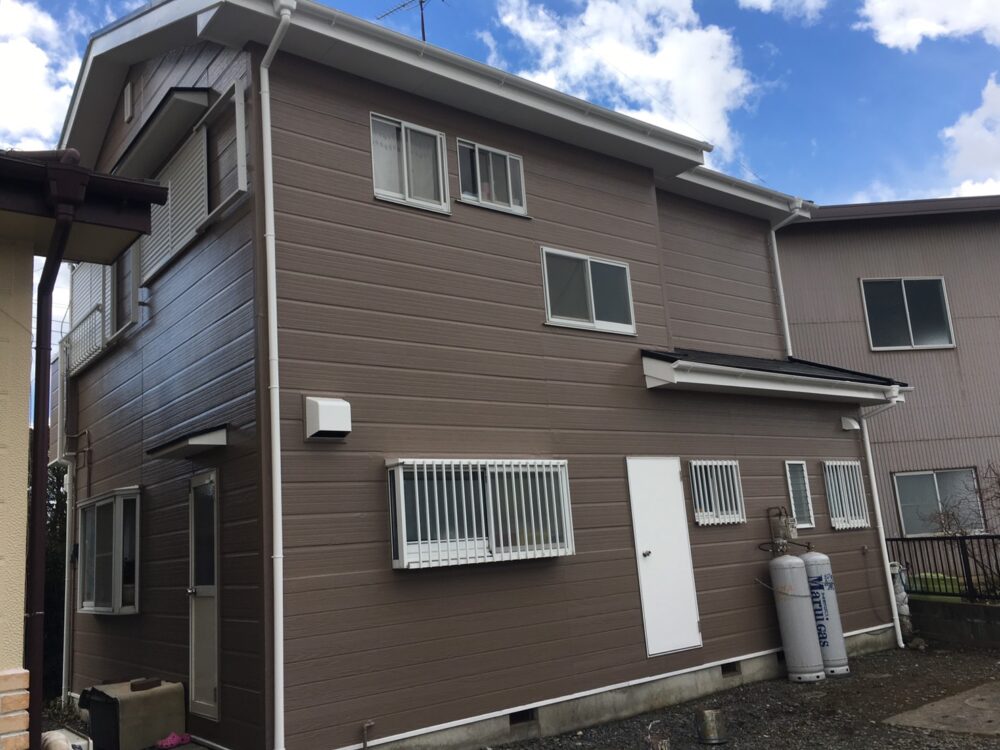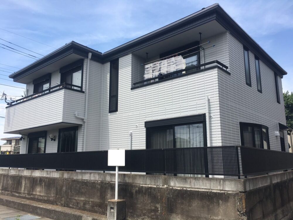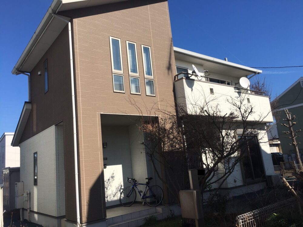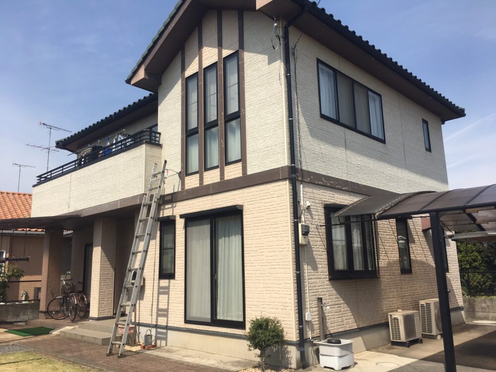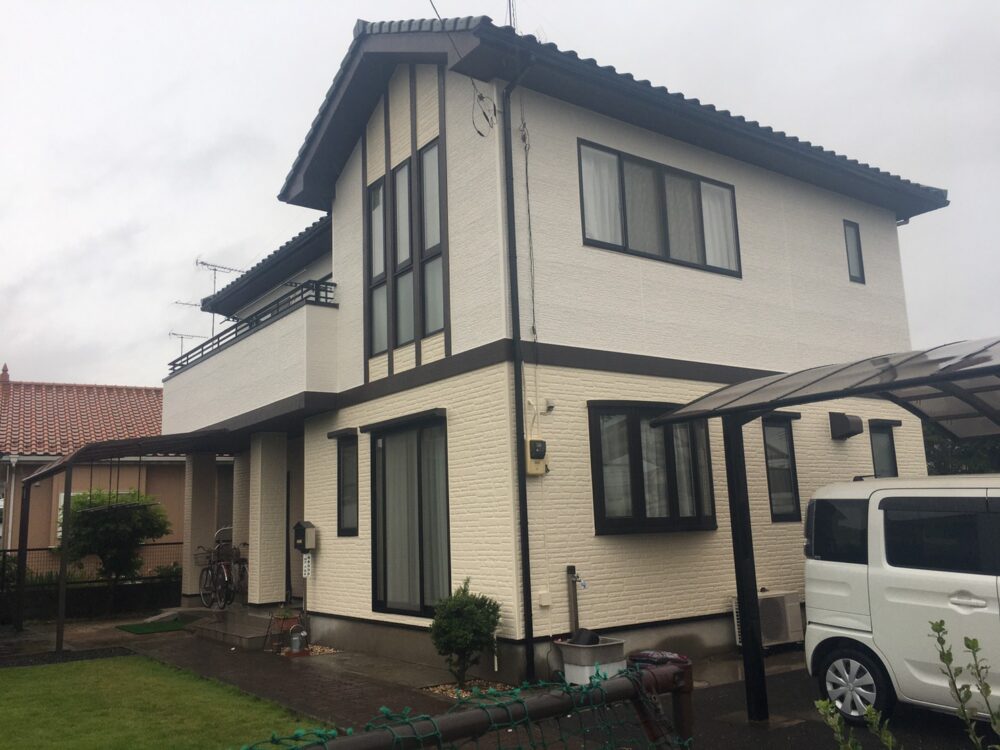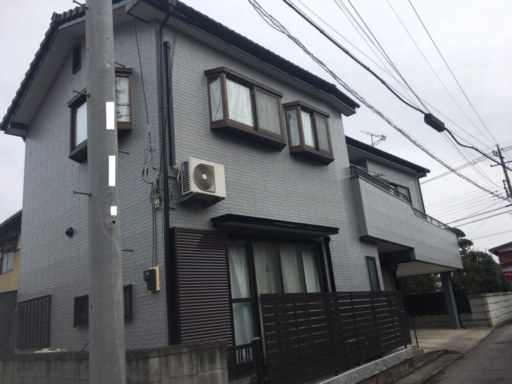 小山市内のグランディハウス住宅にて、外壁塗装を行いました。築年数の経過とともに全体の色あせが見られ、特に日当たりの良い面では塗装のツヤが落ち、ややくすんだ印象になっていました。
