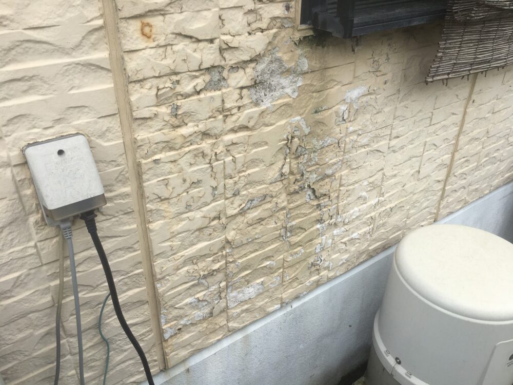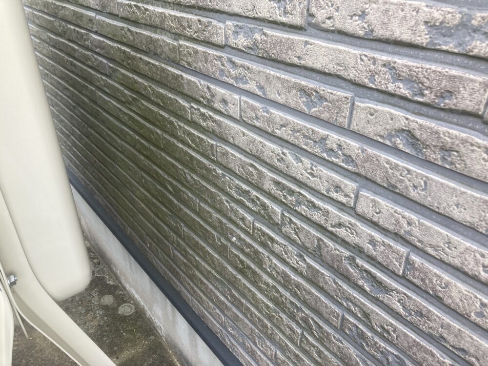 外壁の状態を確認したところ、大きなひび割れはありませんでしたが、表面のツヤが落ち、全体的にややくすんだ印象になっていました。クリアー塗装は、既存の柄や色をそのまま残しながら、表面を保護する方法です。素材の風合いを活かしたい場合に適しています。