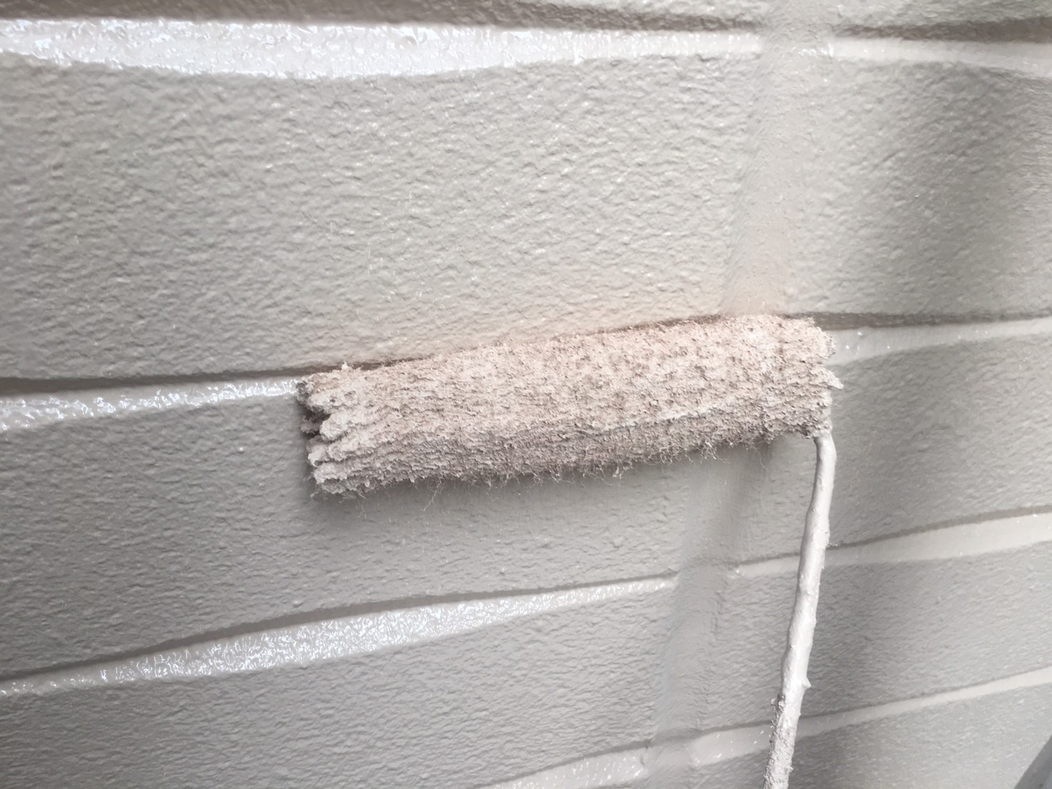 外壁下塗りです。2種類目はこれから塗装をする上塗り材の密着性を高める下塗り材になります。また、外壁の見えにくい細かいひび割れもしっかり埋めてくれる機能もあります。写真のように元の色が分からないくらい真っ白になりますので、元の色の影響なく新しいカラーに塗り替えができます。