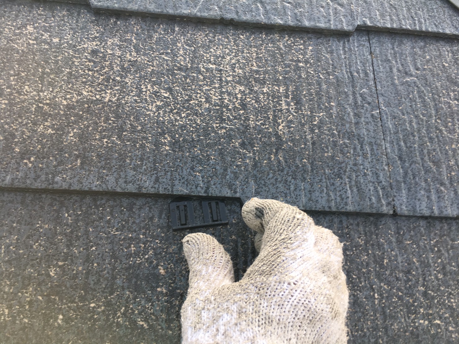 コロニアル屋根の湿気対策「タスペーサー設置」です。コロニアル屋根は、通常は屋根材と屋根材との間に隙間があるのですが、経年と共に隙間が埋まってしまい屋根の通気が確保できなくなります。通気が確保できないことで、湿気が溜まりコケやカビ発生の原因となってしまいます。環境によっては表面が膨れ、剥がれが発生してしまう場合もあります。