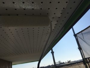 軒天塗装です。軒天は綺麗に見えても湿気の影響で下地が湿っていたり、ふやけていたりすることがあります。塗装の際は、湿気に強い塗装を行い、できるだけ乾いた状態を保てるようにします。