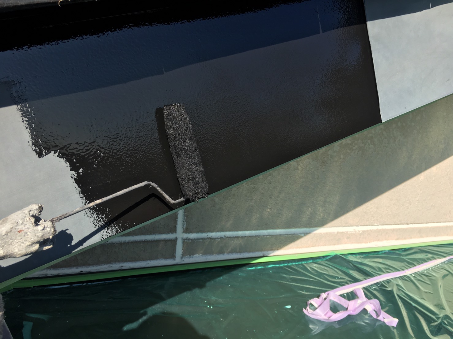 外壁の下塗りです。築20年前後となってくると、外壁の色褪せなど見た目の劣化も感じますが外壁下地の状態も悪くなってきます。特に今回のALCのようなセメント系の外壁は防水性が低いので、下地が弱くなりやすいです。弱ってしまった下地を強く丈夫にさせるのが、下塗りです。下地にしっかり浸透し、脆くなってしまった外壁を復活させることができます。
