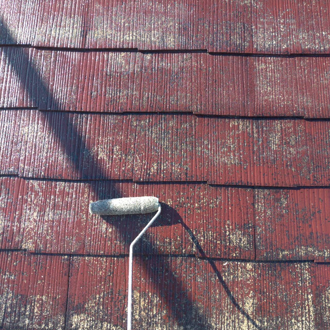 足場設置、メッシュ養生、高圧洗浄が完了しました。屋根の下塗り塗装です。汚れが進行していた屋根ですが、洗浄をしたら元の色が見えてきました(^^)コケも取れてだいぶ綺麗になりました。洗浄してみるとよくわかりますが、表面の塗装の膜が剥がれてしまっていますね。この状態ですと、屋根を守るものがない状態ですから下地が傷んできたり、雨水が浸み込みやすく雨漏りをしてしまう可能性もあります。特に今回のようなコロニアル屋根は耐久性が低く、お悩みの方が増えています。傷んでしまったコロニアル屋根も、下地に合った下塗り材を使用することで強く丈夫に復活させる事ができますよ。