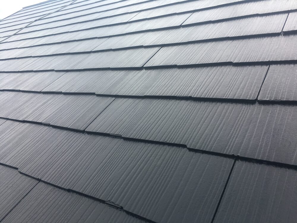 屋根の上塗り塗装です。屋根は強い紫外線、風雨から家を守る大切な部位ですから定期メンテナンスで長持ちさせていくことは必須です。下塗りで下地から丈夫にしましたので、上塗りはより耐久性の良い塗装をお勧めしています。