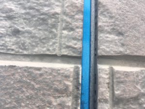 外壁シーリング工事です。まずは古くなったシーリング材を撤去していきます。綺麗に撤去しないと、新しいシーリングを施工したときに綺麗にできませんので撤去も丁寧に行います。写真の青い部分が見えている箇所がシーリングがあった部分です。