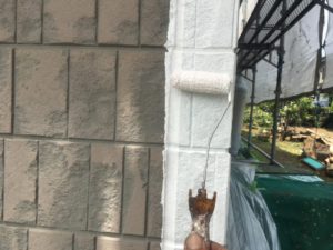外壁の下塗りです。経年劣化で弱くなってしまった外壁を強く復活させるために下塗りはとても大切です!!今回使用の下塗り材は、密着性が高く剥がれなどから守ることができます。また、しっかりと真っ白になりますので、どんな色でも綺麗に仕上がります。下地が濃い色でも、影響なく淡い色への塗り替えができますよ(^^)