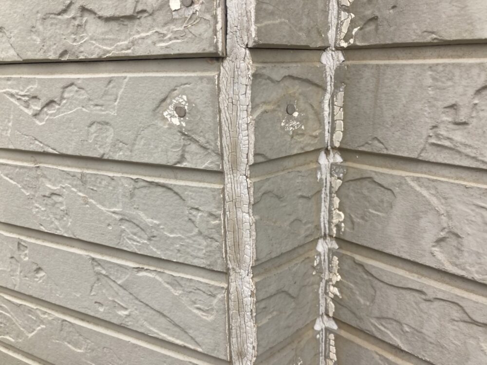 サイディング部の塗装です。写真は施工前です。汚れや色褪せ、シーリング部の劣化やひび割れが目立ちました。
