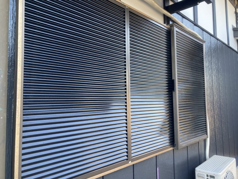 雨戸塗装の施工前、施工後です。雨戸はスチール製ですので色褪せが進行すると錆びてしまう可能性があります。今回はブラックで塗装をしカッコいいイメージになりました。面積の大きい付帯部なので、存在感もありますね!