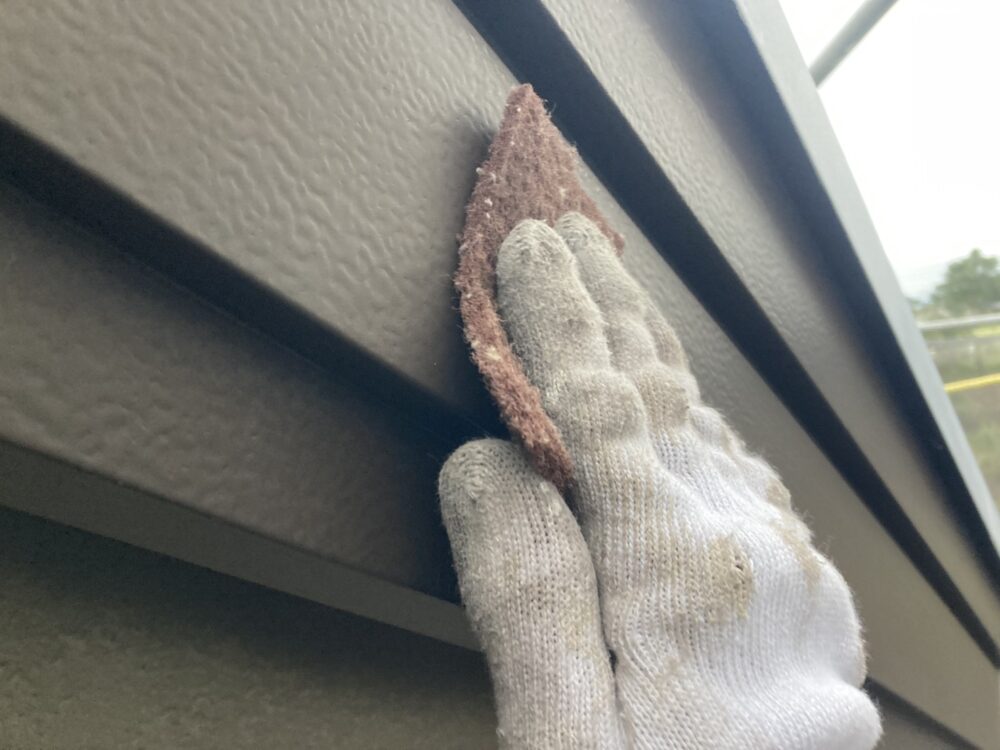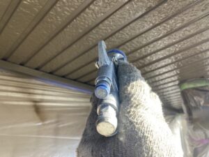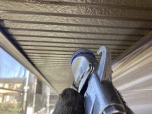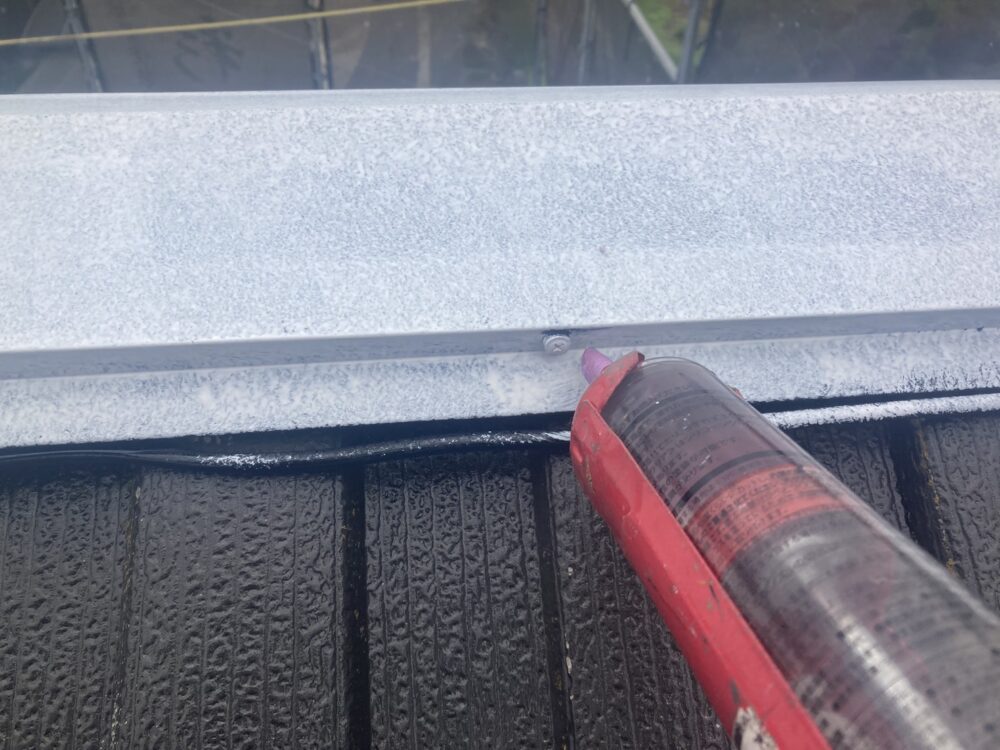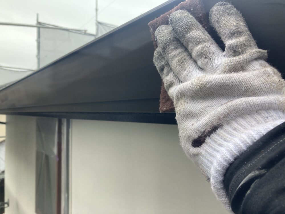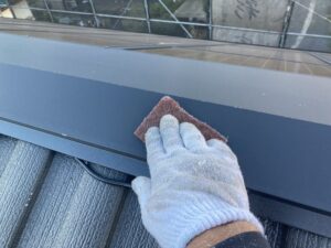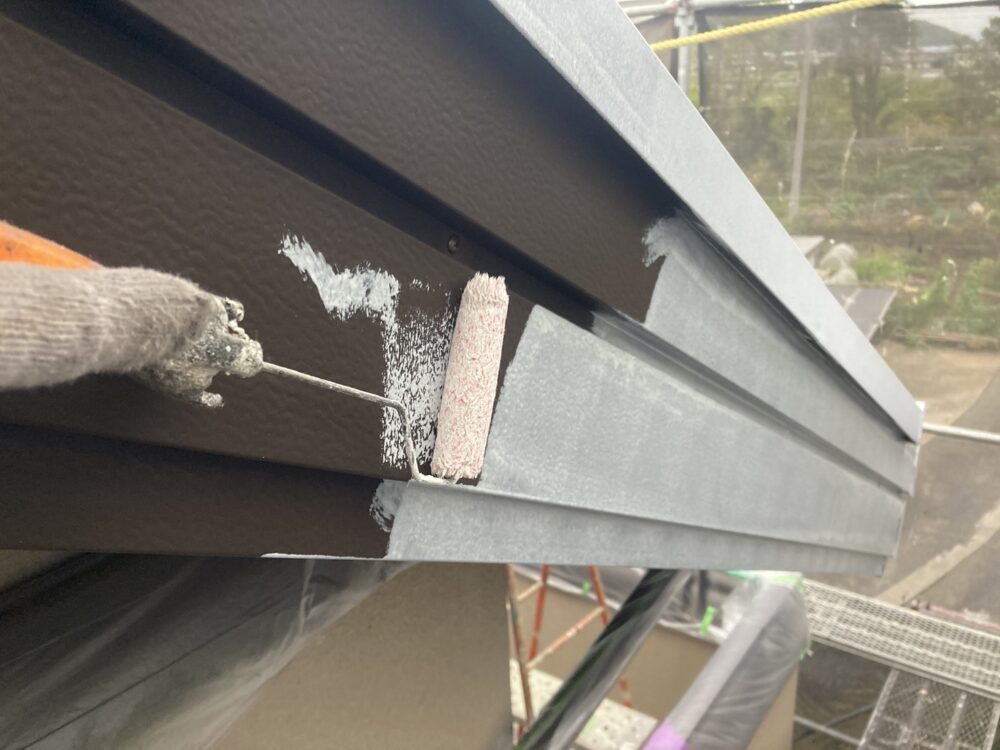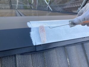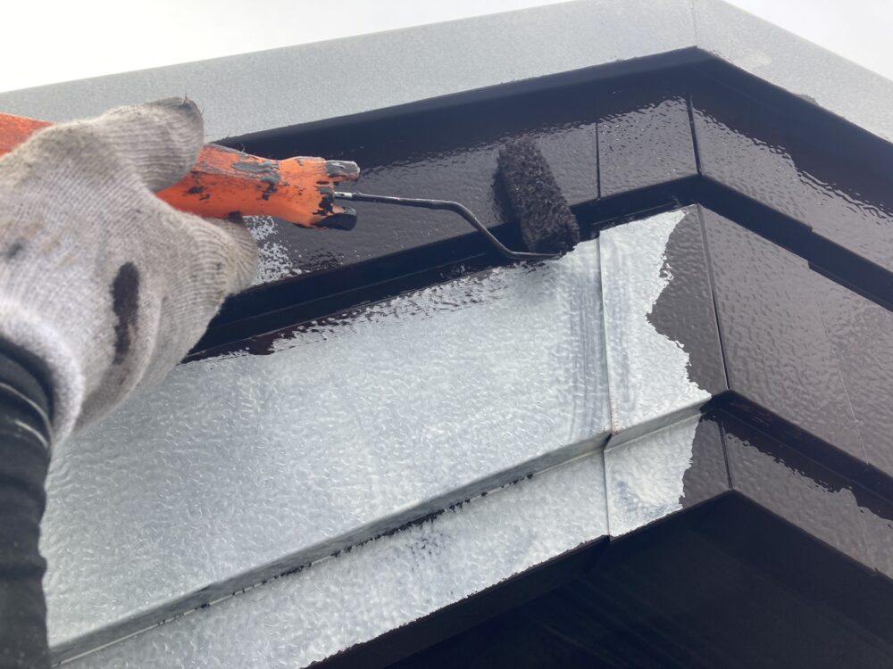 屋根の棟板金部分は、塗装前に下地処理を行います。ケレンで汚れやサビを落とし、錆止めを塗って劣化を防止。すき間や固定部はシーリングで補修し、雨水の侵入を防ぐことで長持ちする仕上がりになります。