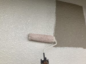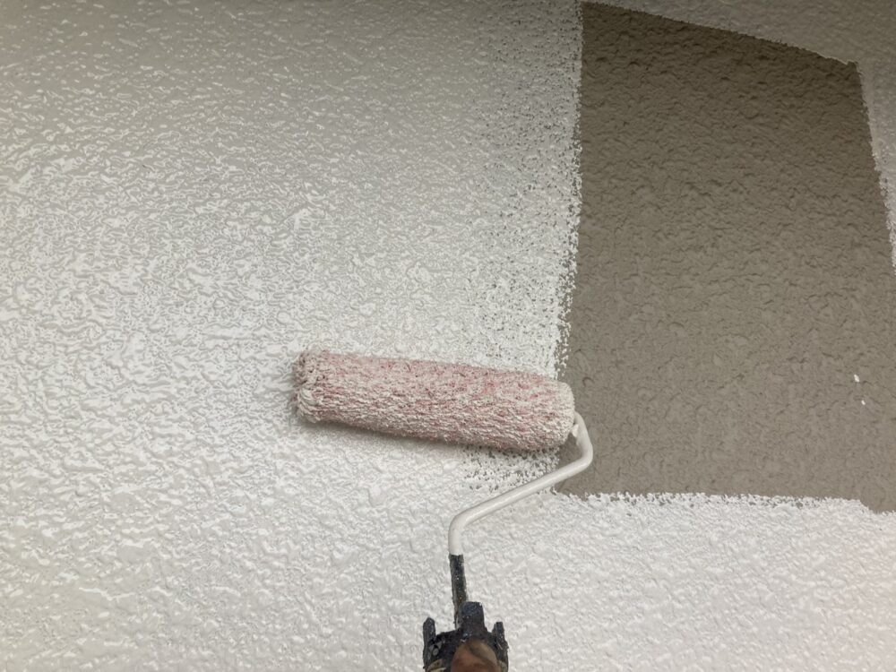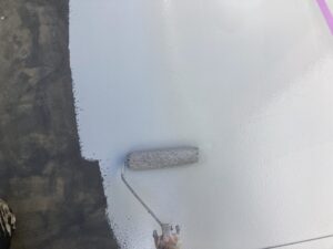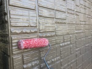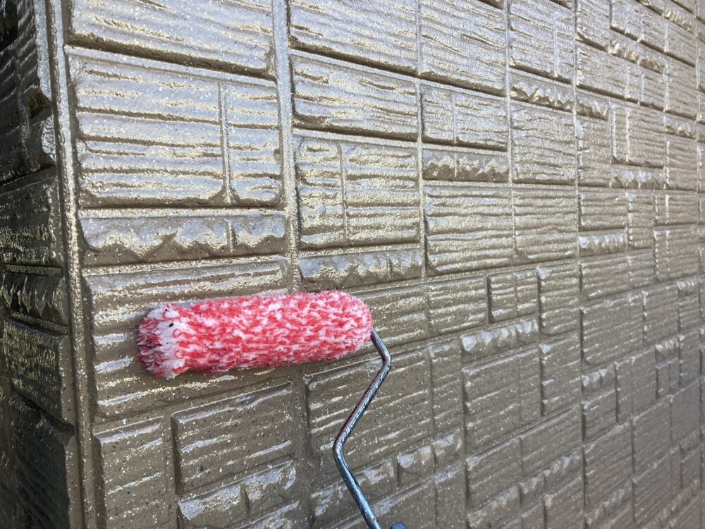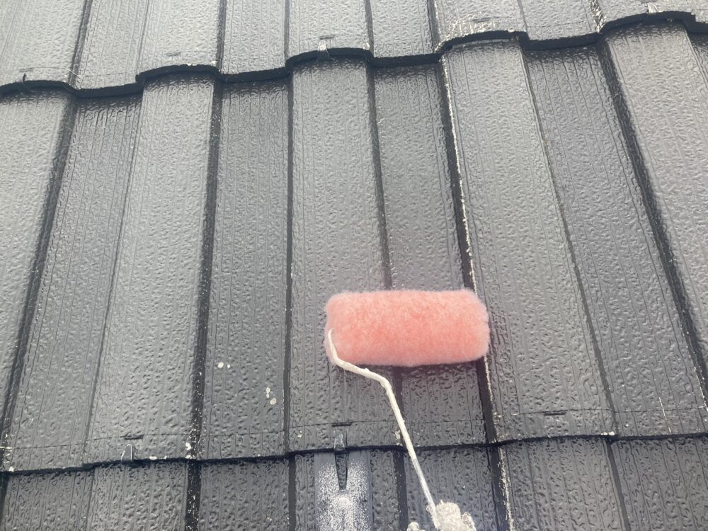 屋根の下塗りには、日本ペイントのファインパーフェクトベスト強化シーラーを使用しました。屋根材はセキスイモニエル瓦で、専用下塗り材を使うことで塗料の吸い込みを抑え、しっかりと密着させることができます。下塗りを丁寧に行うことで、上塗りの仕上がりが均一になり、色ムラや早期劣化を防止。屋根塗装を長持ちさせるために欠かせない重要な工程です。