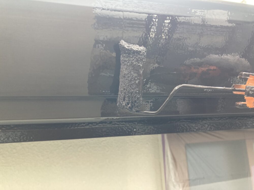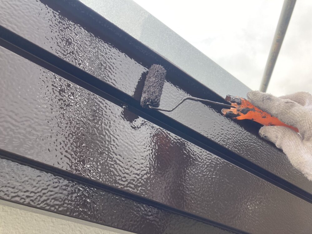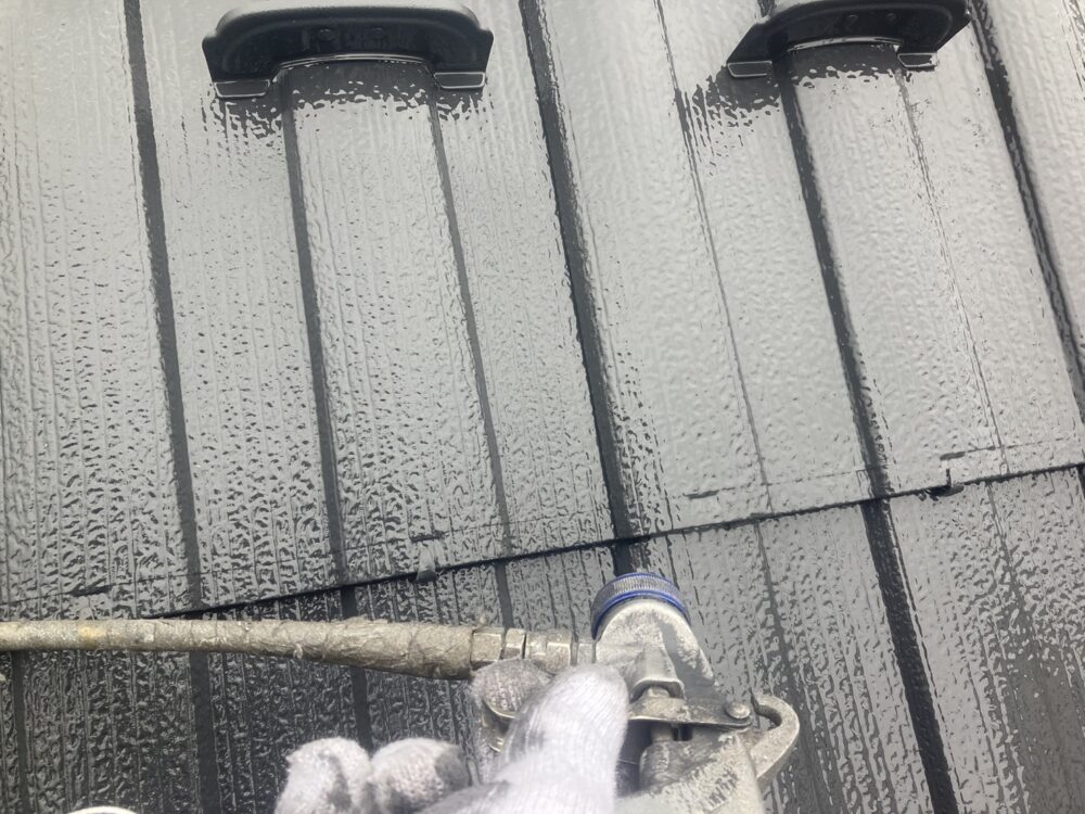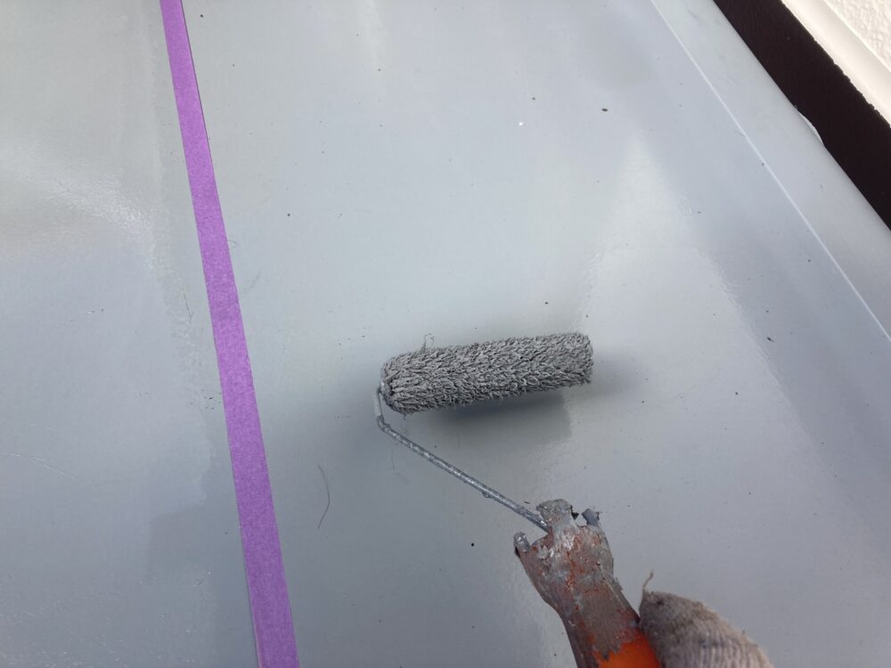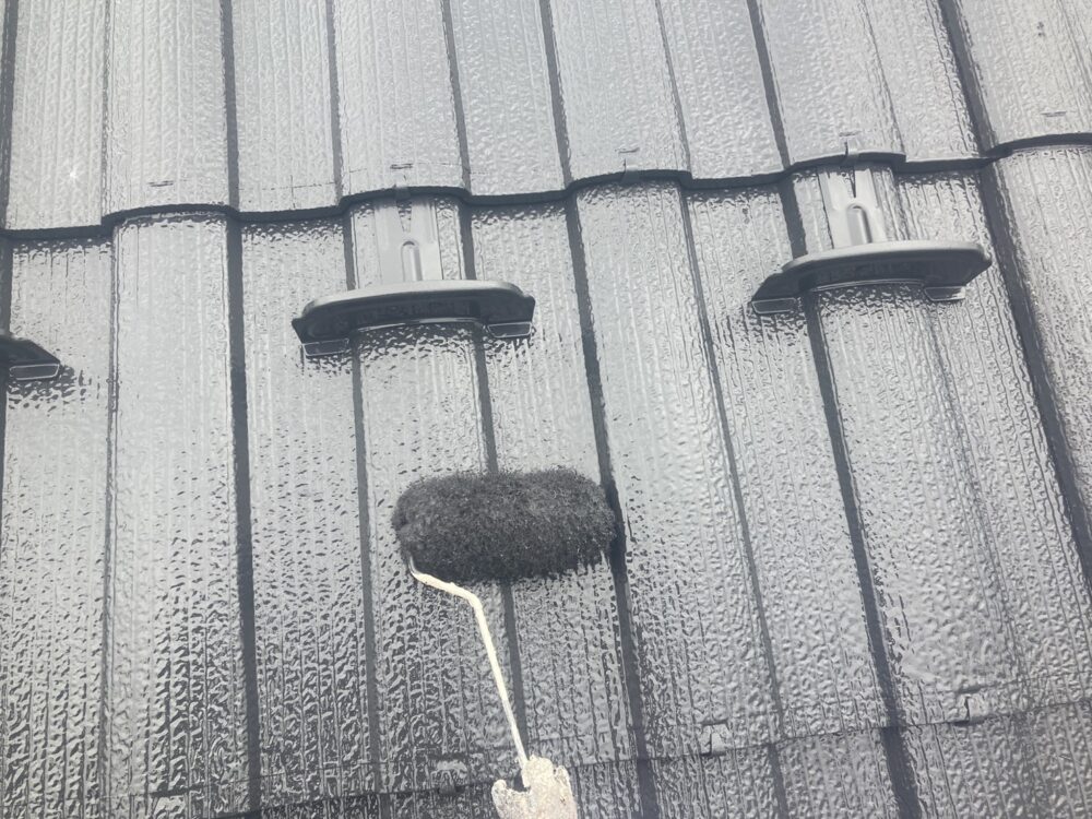 屋根の中塗り・上塗りには、日本ペイントのグランセラベスト2液ファインを使用しました。無機成分を配合した高耐久塗料で、紫外線や雨風に強く、色あせや劣化を抑えるのが特長です。中塗りで塗膜に厚みを持たせ、上塗りでしっかり仕上げることで、美観と耐久性を両立。屋根を長く守るための大切な工程です。