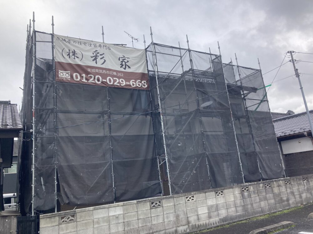外壁塗装の工事は、最初に足場を組むところから始まります。これは職人が安全に動きやすく、きれいに塗るための大切な準備です。まわりを覆うメッシュ養生は、塗料の飛び散りを防ぎ、ご近所への配慮にもなる安心のための対策です。