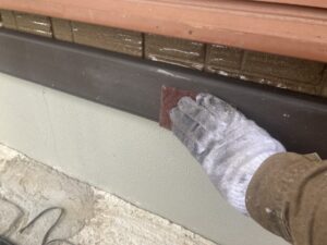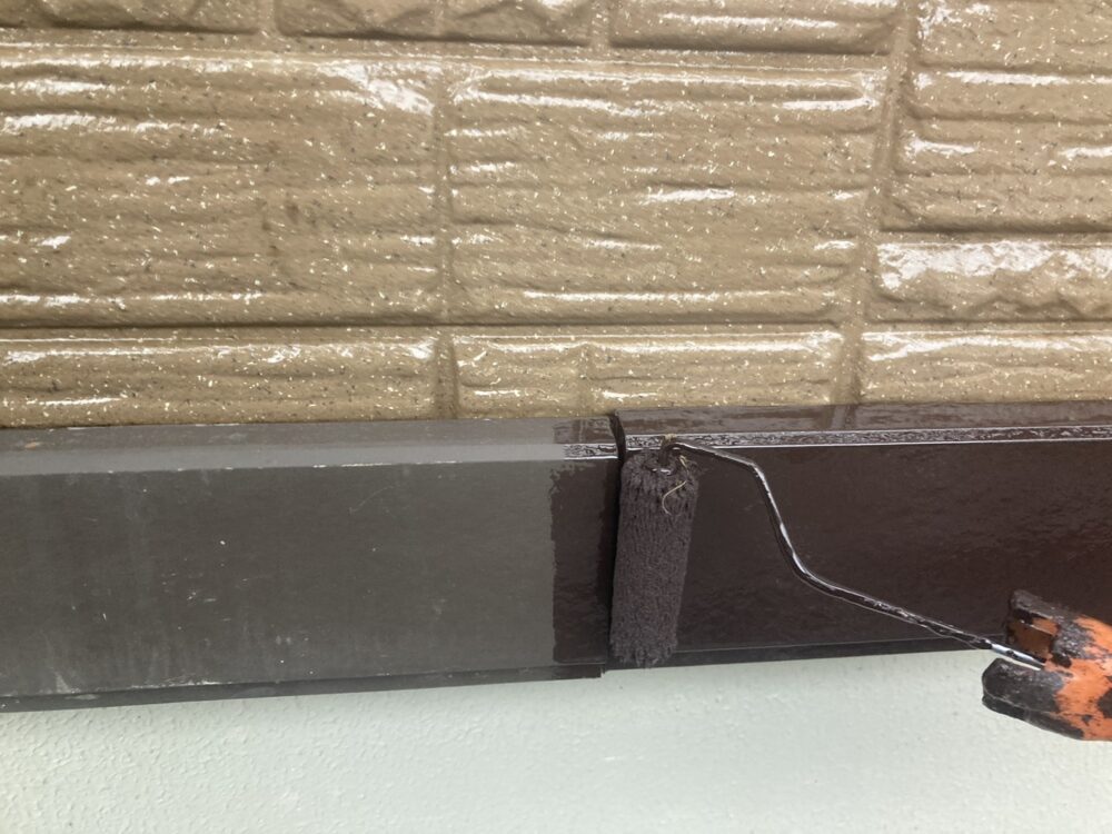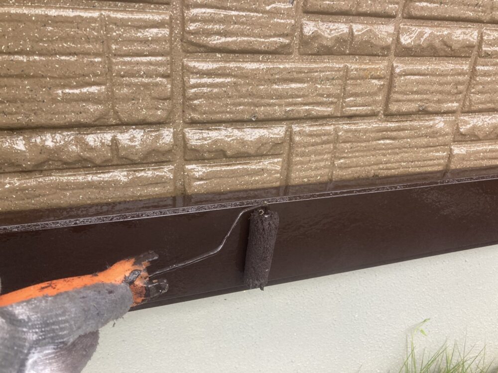 巾木塗装では、まずケレン作業で汚れや古い塗膜を落とし、塗料が密着しやすい下地を整えます。その後、上塗りを行い、仕上げの色はブラウンで落ち着いた印象に。巾木は地面に近く汚れや湿気の影響を受けやすい部分のため、塗装によって劣化を防ぎ、建物の基礎まわりを保護します。見た目も引き締まり、外観全体の印象が良くなります。