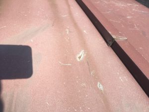 トタン屋根全景です。全体的に色褪せが進行しています。屋根材を触ってみると、古い塗装の膜がベッタリとつきました。塗膜が機能していませんので、素地が剥き出し状態です。トタン屋根はスチール製ですので、色褪せの進行から「錆」発生の可能性もあります。錆が進行すると、穴が開いてしまったり致命的な状態になることもありますので、早めの塗装が必要です。