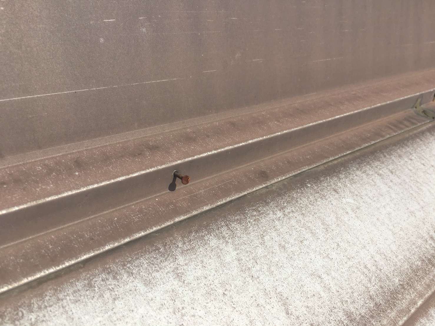 棟部、瓦棒です。おさえている釘が抜けてしまっています。錆て劣化していますので打ち替えを行います。