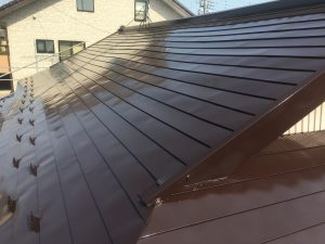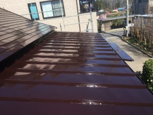 屋根上塗りです。フッ素系高耐久塗料で2回塗り。下塗りと合わせて4回塗りです。※光の加減で仕上がりの色が違って見えています。ご了承ください。使用塗料:日本ペイント 1液ファイン4Fルーフ