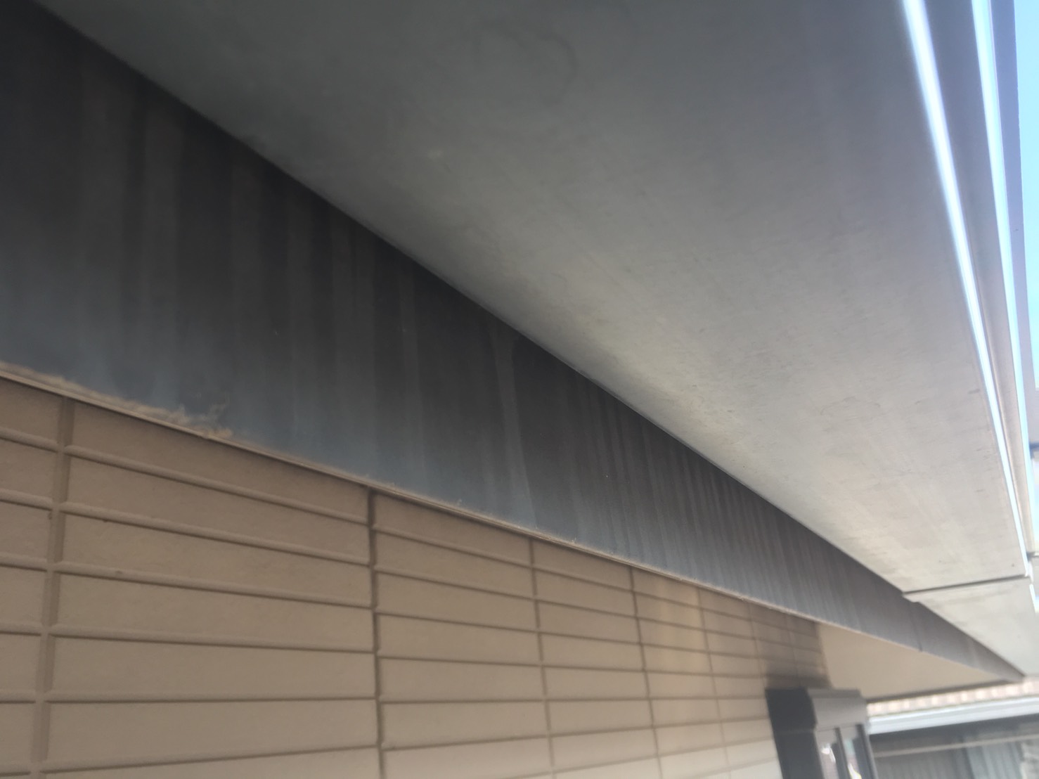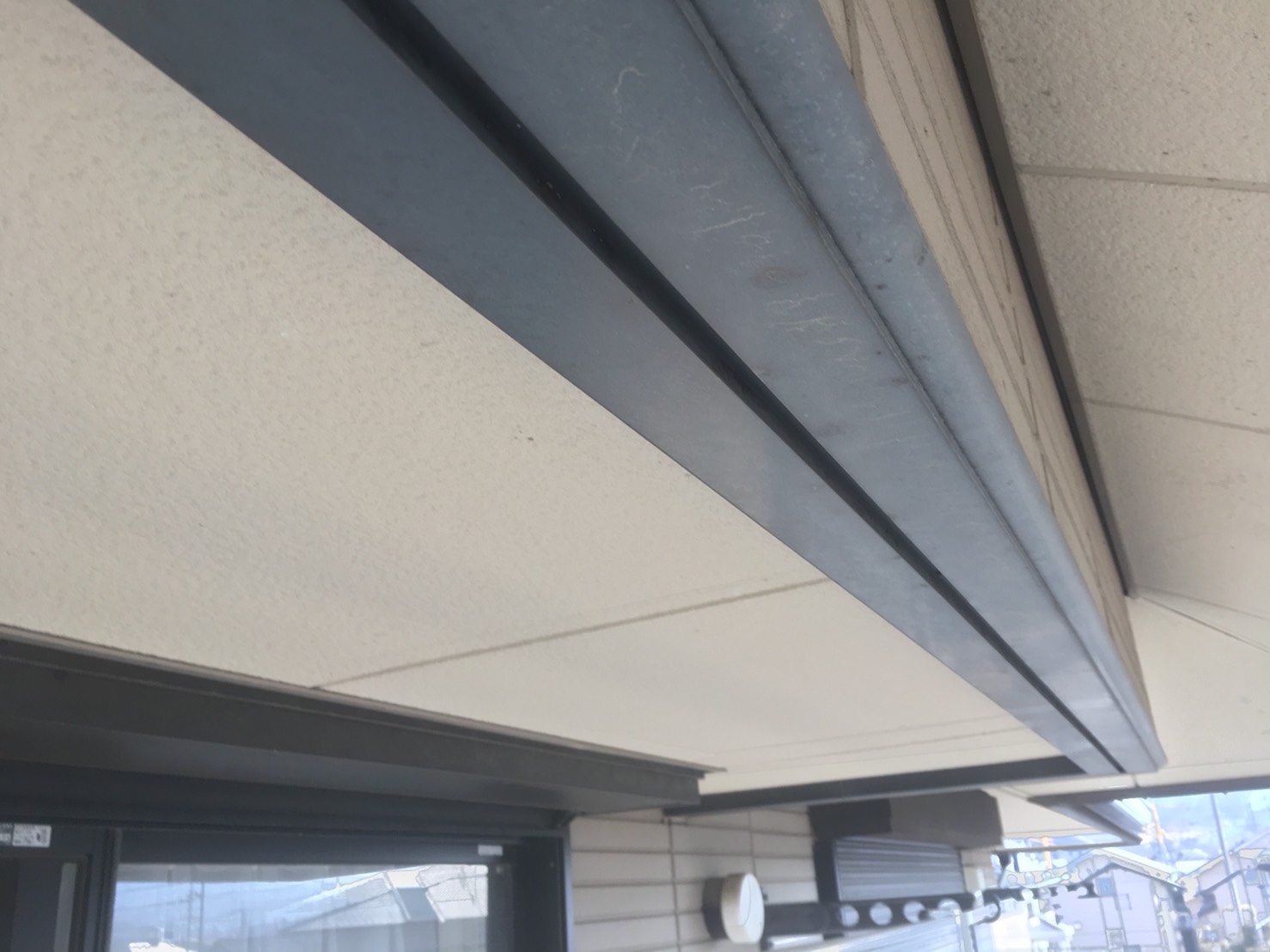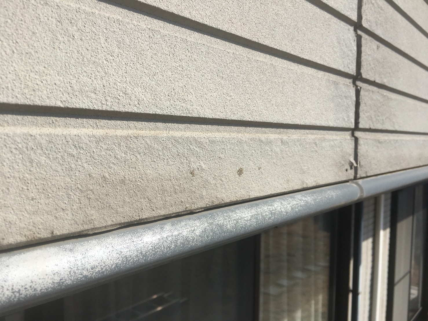 雨樋関係です。白っぽく色褪せ、塗装の膜が剥がれています。樋に使われている素材は、表面コーティング(塗装の膜)が剥がれてしまうと、素材そのものが硬くなり破損してしまう可能性があります。破損してしまうと交換となってしまいますので、定期的に塗装をして長持ちさせてあげることが良いです。