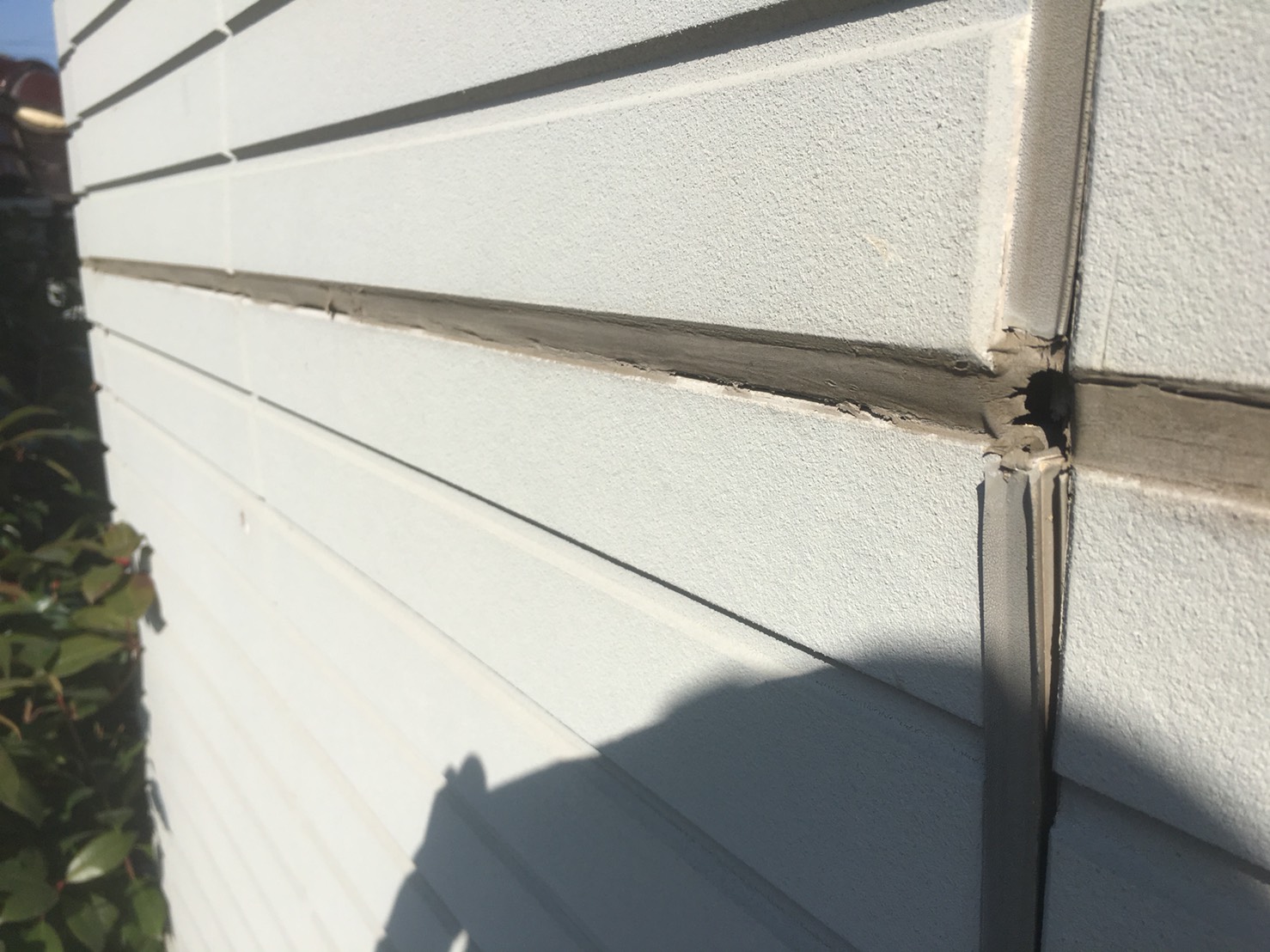 外壁に大き目のひび割れがありました。ひび割れも、外壁を守るコーティング(塗装の膜)が剥がれて落ちてしまっている事が大きな原因です。ひび割れは進行し大きくなっていきます。また、割れた部分から微量ですが雨水が入り込み外壁内部が傷んでしまう原因にもなります。