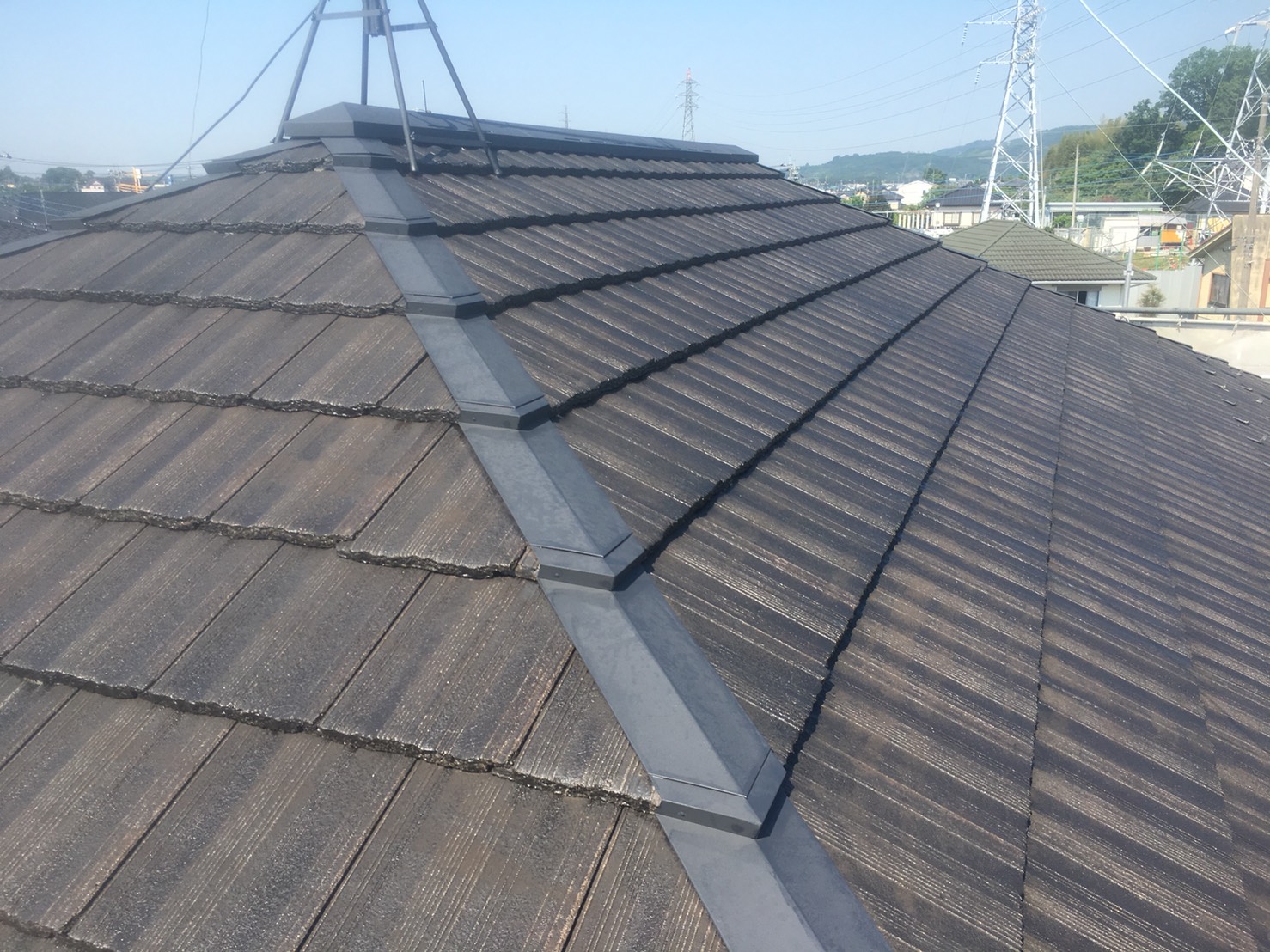 棟部は金属ですので、錆びないように錆止め材を塗装します。上塗りは屋根材と同じものを使います。