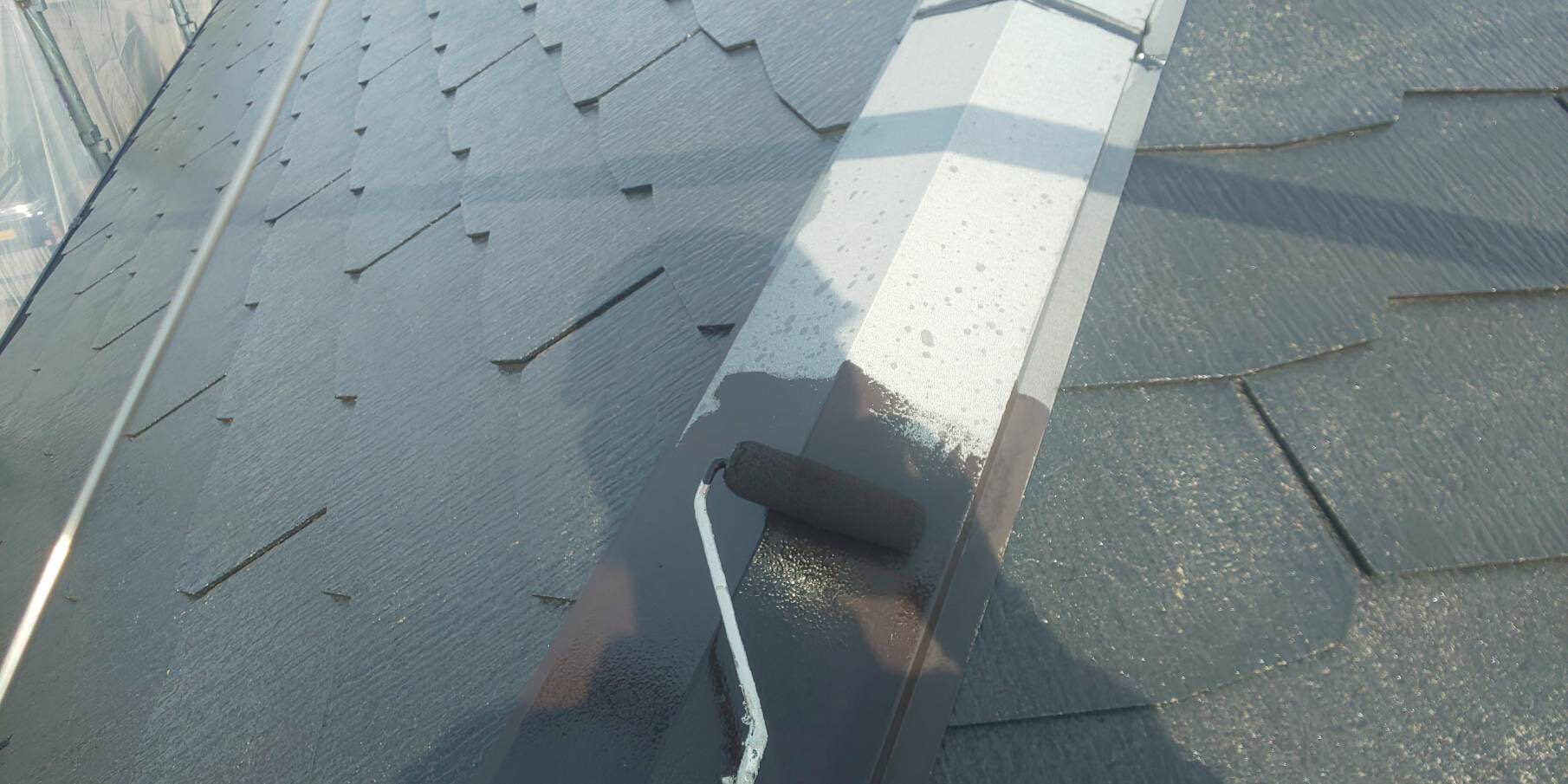 屋根塗装です。まずは屋根の下地処理からはじめます。屋根には「棟」と呼ばれる屋根を押さえている部分があります。写真の白(シルバー)の部分です。棟は屋根全体の中でも特に風の影響を受けやすい部分ですので、塗装の前には破損はないか、補修は必要かどうかなど必ず確認します。棟部はビスや釘で留めてあるのですが、新築から20年近く経過しているとビスや釘が取れそうになっていたり、取れていたり、錆びていたりと補修が必要な状態である事がほとんどです。正常な状態に補修を行い、取れないようにシーリングで固定をします。他に、棟部の繋ぎ目などのシーリングが切れていたり劣化している場合は打ち直します。
