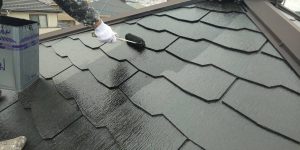 屋根下塗りです。今回もそうですが、屋根塗装で一番多いスレート屋根は軽量安価で新築時はとても人気な屋根材ですが、約10年もすると遠目から見ても汚れや色褪せが酷くなり、耐久性があまりよくない事がわかりお客様からご相談を受ける事が多くなっています。