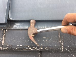 劣化してしまった釘やビスは打ち替えを行い、その後シーリングで取れないように固定します。棟部は金属製ですので後で錆び止め材を塗装します。