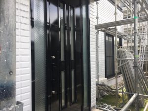 玄関扉塗装の完成です!!色褪せが進行していましたが、艶感が戻りとても綺麗な玄関扉になりましたよ(*^_^*)毎日出入りする玄関ですから、綺麗になると気持ちがいいですね。塗装は超速乾タイプで、塗装後でも数分で乾いてしまう塗料を使っていますので乾き待ちをすることなくいつも通り玄関の出入りができますのでご安心くださいね。