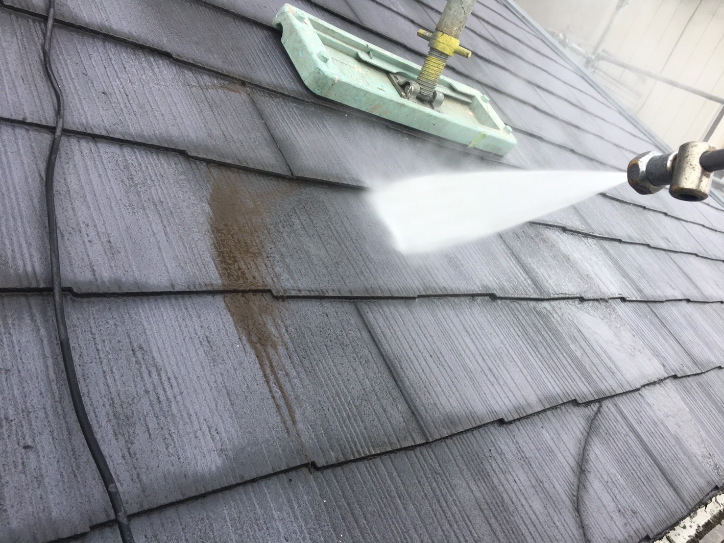 高圧洗浄です。「家を洗う」というのは、おそらく新築からやっていないことだと思いまうすので、長年の汚れや誇りなどを隅々まできれいに洗い流します。屋根洗浄で使う、トルネード洗浄は外壁の洗浄よりもパワーがありますので、洗うというより水の力で削ぎ落すというほうが合っているかもしれません。古い塗装の膜、カビや藻などの雑菌、コケなども綺麗に落としていきます。
