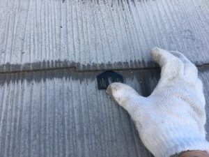 代わりに「タスペーサー」というものを屋根材に差し込み、強制的に通気確保をします。写真の黒い小さなものです。この施工はコロニアル屋根、スレート屋根の場合は必ずお勧めしています。逆に屋根材が乾いてしまい、隙間が大きくなってしまっていると施工ができない場合もあります。事例は色々とありますので調査の際に、判断させてもらえたらと思います。