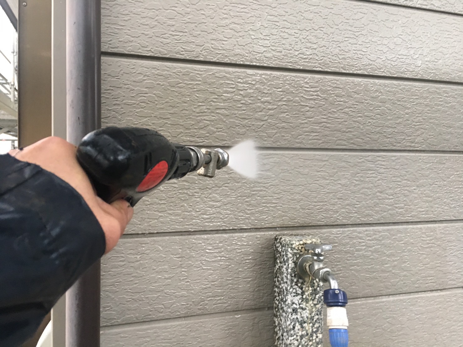 高圧洗浄です。「家を洗う」というのは、おそらく新築からやっていないことだと思いまうすので、長年の汚れや誇りなどを隅々まできれいに洗い流します。屋根洗浄で使う、トルネード洗浄は外壁の洗浄よりもパワーがありますので、洗うというより水の力で削ぎ落すというほうが合っているかもしれません。古い塗装の膜、カビや藻などの雑菌、コケなども綺麗に落としていきます。