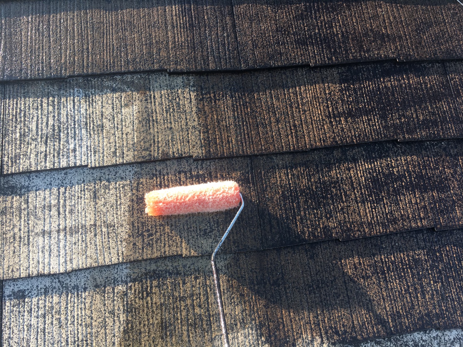 屋根塗装の上塗りです。下塗りや下地処理をしっかり行いましたので屋根材の状態もだいぶよくなっています。上塗りである仕上げ塗装は、下地の状態を整えてから行うことが基本です。最近のお客様は、できるだけ高グレード塗装をして長持ちさせたいという方が増えています。弊社では、現状に合ったプランをご提案できます。傷んでしまっていても下塗りや補修で現状回復できる場合もあります。まずはご相談くださいね。