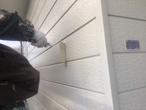 外壁塗装の下塗りです。今回は金属サイディングですので下塗り材は錆止め材を使用しました。下塗り材は現状や下地に合った下塗り材を選ぶことが必須です。外壁塗装の見積もりをしてもらった場合は下塗りに何を使うかも気にしてみるといいですよ。
